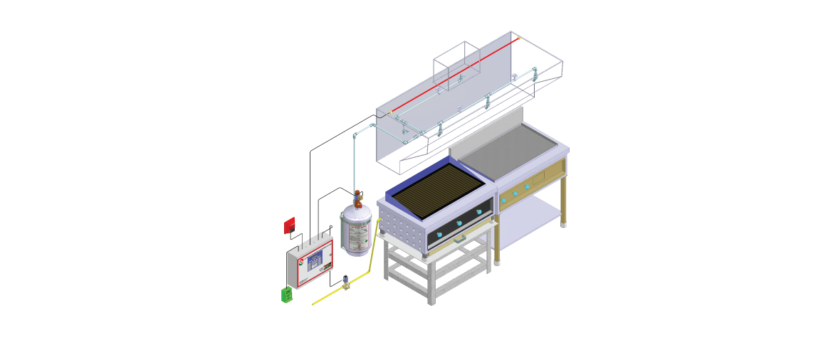 Sprays special form type fire suppressant on the plenum area, cooking surface, and exhaust duct at a predetermined flow rate.